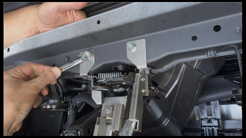 ボンネットフードロックを固定していたボルトを利用して、ボンネットロックを取り付けます。